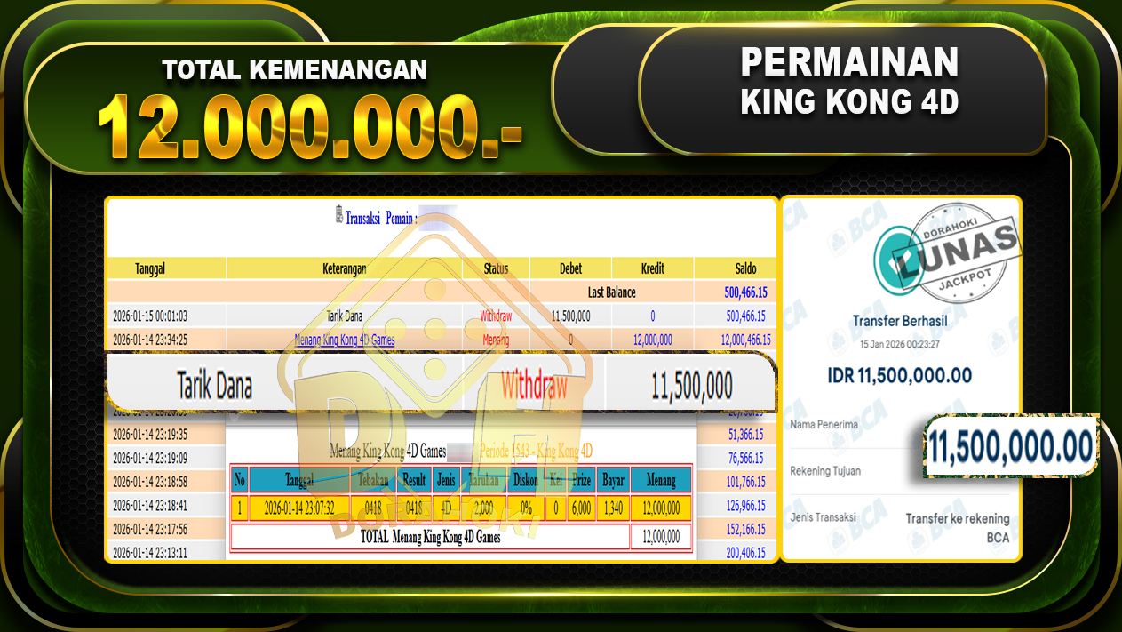Bukti JP TOGEL KingKong 4D – ucapkan selamat kepada user id tunxxxx atas kemenangan di TOGEL KingKong 4D dengan total kemenangan Rp.12.000.000,- Yang pasti nya langsung LUNAS sesuai bukti ya bosku. Dorahoki nih bosku berapapun akan tetap kami bayar lunas ya bosku