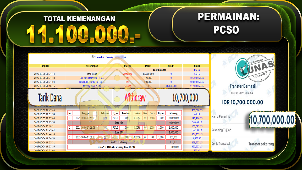 Bukti JP TOGEL PCSO – Yang kami berikan ini sah dan real tanpa di rekayasa bosku dan hanya bertujuan untuk meningkatkan kepercayaan member kami dan memberikan kenyamanan saat bermain jadi bosku tidak perlu khawatir MENANG BERAPAPUN PASTI KAMI BAYAR LUNAS!!