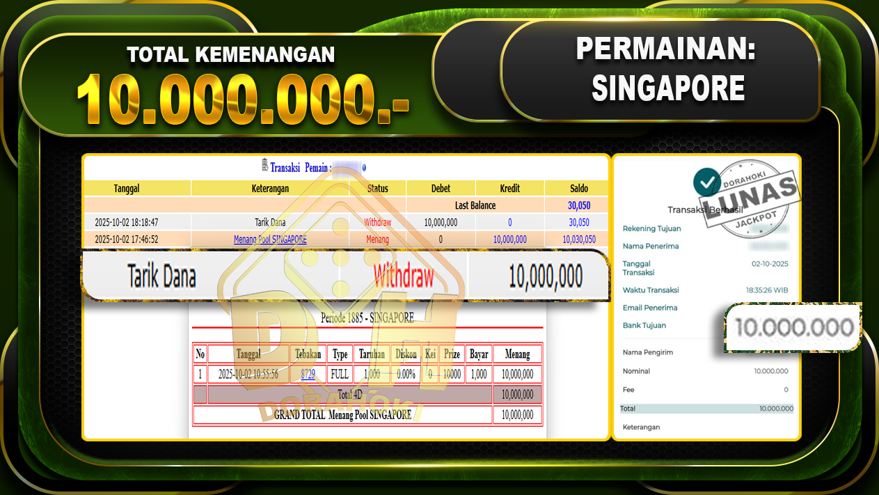 Bukti JP TOGEL SINGAPORE – ucapkan selamat kepada user id proxxxxx atas kemenangan di TOGEL SINGAPORE dengan total kemenangan Rp.10,000,000,- Yang pasti nya langsung LUNAS sesuai bukti ya bosku. Dorahoki nih bosku berapapun akan tetap kami bayar lunas ya bosku