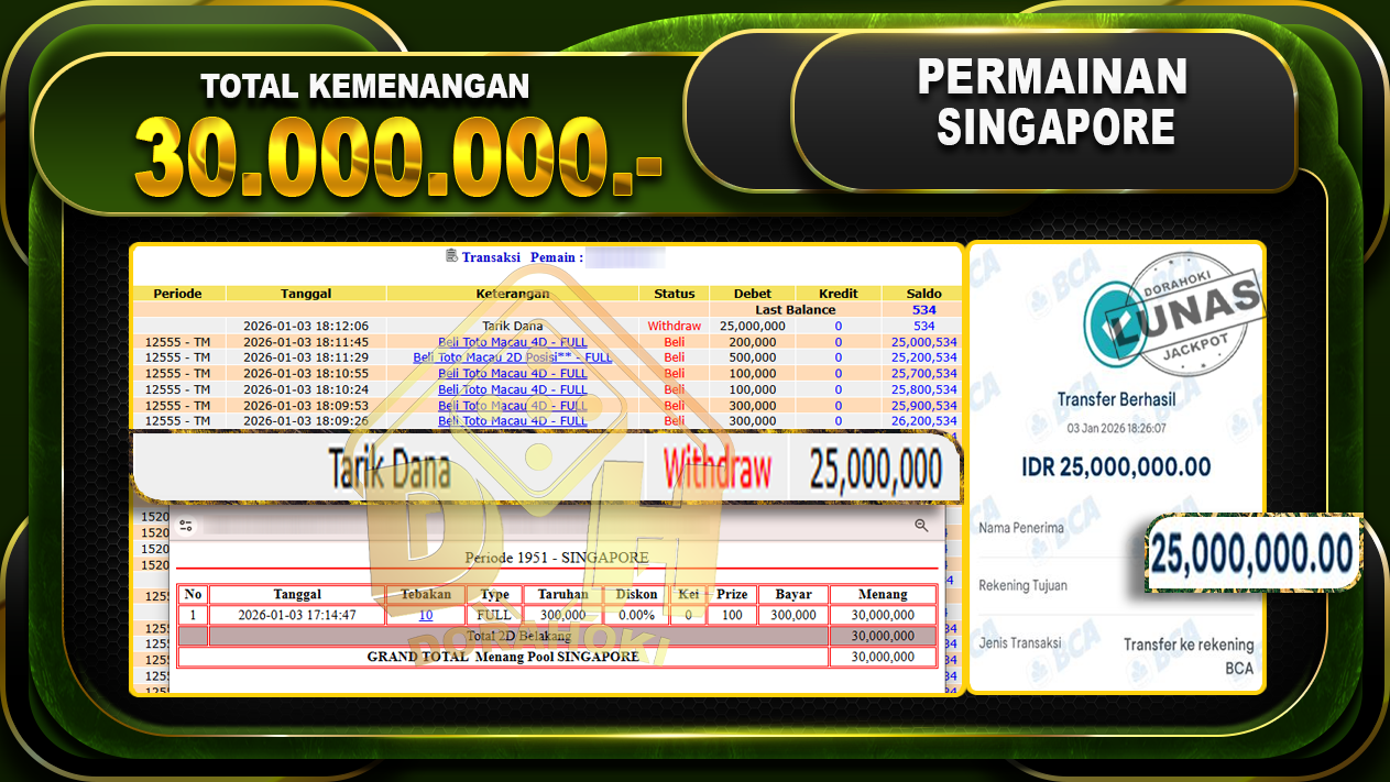 Bukti JP TOGEL SINGAPORE – ucapkan selamat kepada user id alexxxxx atas kemenangan di TOGEL SINGAPORE dengan total kemenangan Rp.30,000,000,- Yang pasti nya langsung LUNAS sesuai bukti ya bosku. Dorahoki nih bosku berapapun akan tetap kami bayar lunas ya bosku