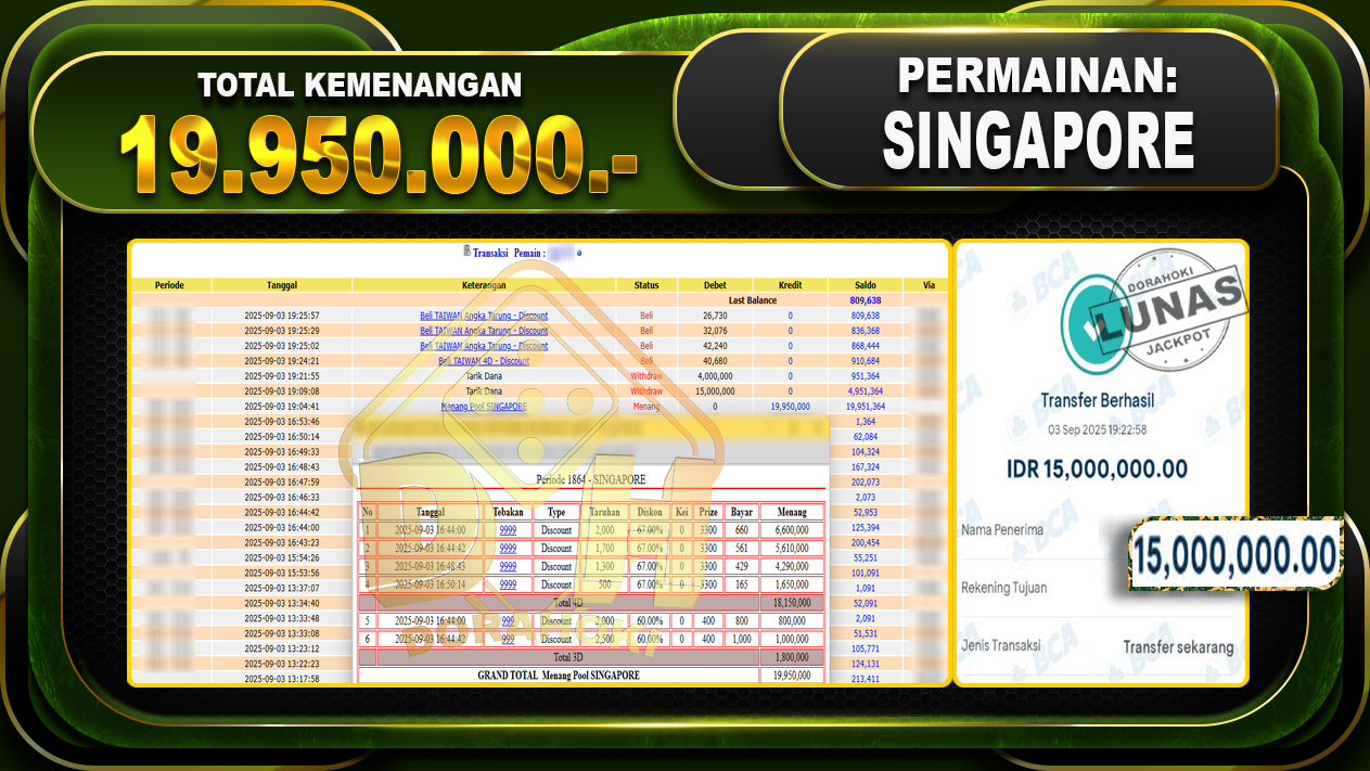 Bukti JP TOGEL SINGAPORE – ucapkan selamat kepada user id Sigxxxxx atas kemenangan di TOGEL SINGAPORE dengan total kemenangan Rp.19,950,000,- Yang pasti nya langsung LUNAS sesuai bukti ya bosku. Dorahoki nih bosku berapapun akan tetap kami bayar lunas ya bosku