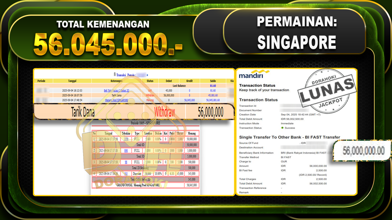 Bukti JP TOGEL SINGAPORE – ucapkan selamat kepada user id Wajxxxxxx atas kemenangan di TOGEL SINGAPORE dengan total kemenangan Rp.56,045,000,- Yang pasti nya langsung LUNAS sesuai bukti ya bosku. Dorahoki nih bosku berapapun akan tetap kami bayar lunas ya bosku