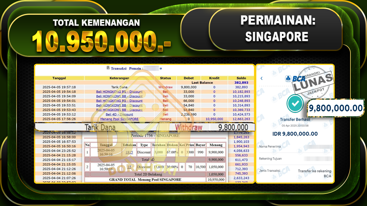 Bukti JP TOGEL SINGAPORE – ucapkan selamat kepada user id Kisxxx atas kemenangan di  TOGEL SINGAPORE  dengan total kemenangan Rp.10.950.000,- . Yang pasti nya langsung LUNAS sesuai bukti ya bosku. Dorahoki nih bosku berapapun akan tetap kami bayar lunas ya bosku.