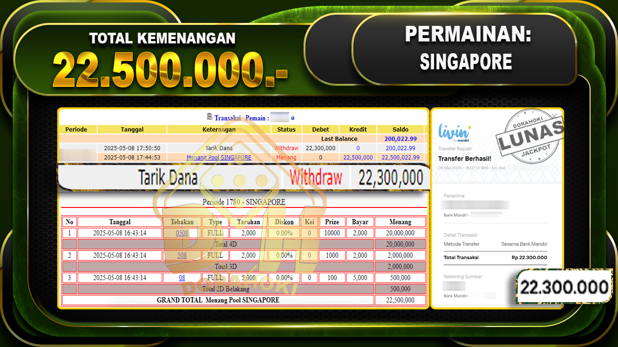 Bukti JP TOGEL SINGAPORE – ucapkan selamat kepada user id Otnxxx atas kemenangan di  TOGEL SINGAPORE  dengan total kemenangan Rp.22.500.000,- . Yang pasti nya langsung LUNAS sesuai bukti ya bosku. Dorahoki nih bosku berapapun akan tetap kami bayar lunas ya bosku.