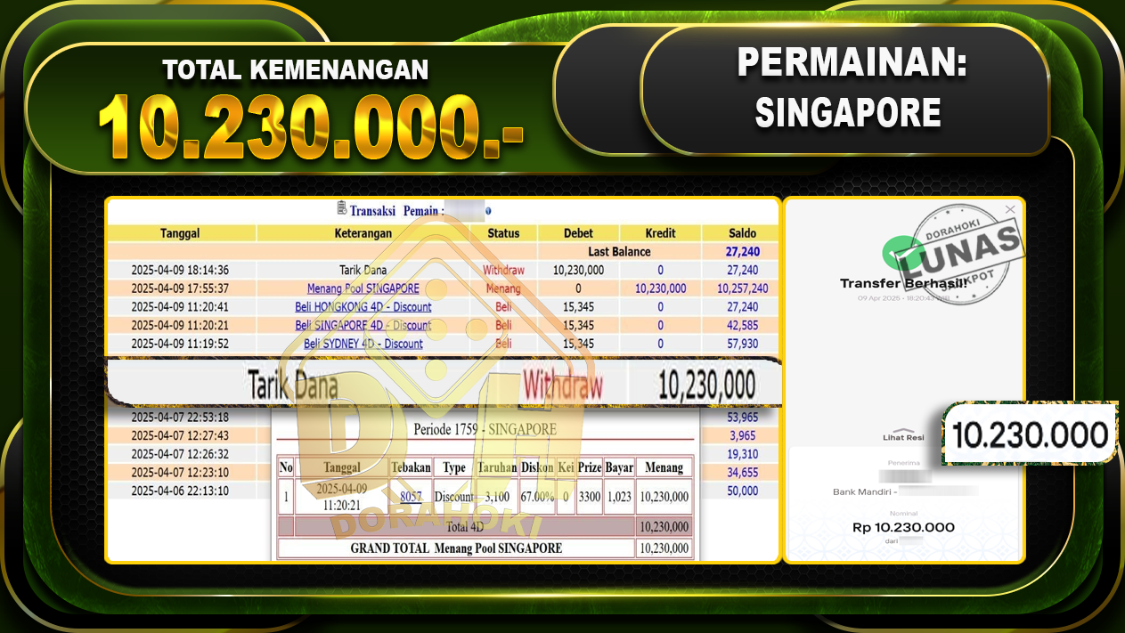 Bukti JP TOGEL SINGAPORE – ucapkan selamat kepada user id Boixxx atas kemenangan di TOGEL SINGAPORE dengan total kemenangan Rp.10.230.000,- . Yang pasti nya langsung LUNAS sesuai bukti ya bosku. Dorahoki nih bosku berapapun akan tetap kami bayar lunas ya bosku.