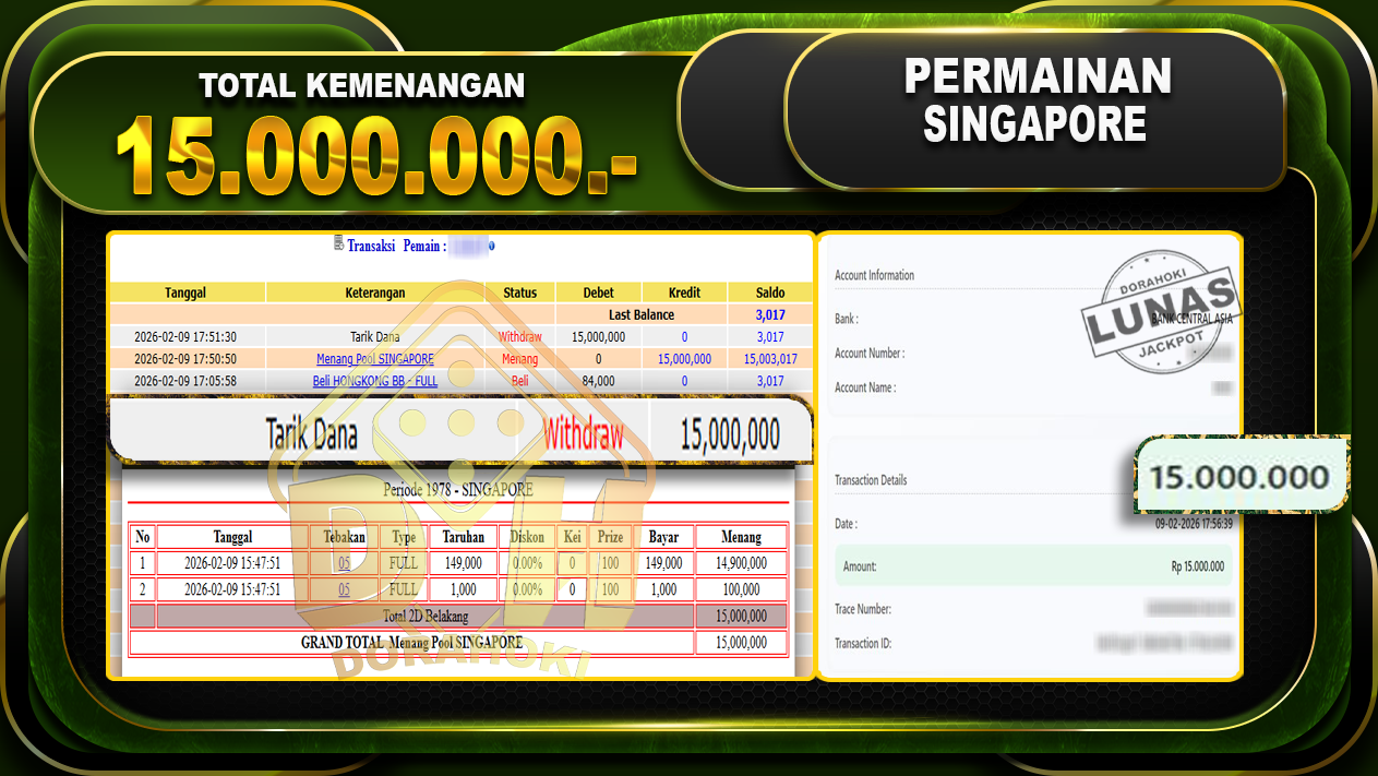 Bukti JP TOGEL SINGAPORE – Selamat Kepada User ID : wadxxx atas kemenangan TOGEL SINGAPORE Dengan Nominal Sebesar Rp 15.000.000,- . Yang pasti nya langsung LUNAS Sesuai Bukti.