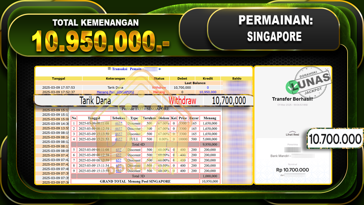 Bukti JP TOGEL SINGAPORE – ucapkan selamat kepada user id Imrxxx atas kemenangan di TOGEL SINGAPORE dengan total kemenangan Rp.10.950.000,- . Yang pasti nya langsung LUNAS sesuai bukti ya bosku. Dorahoki nih bosku berapapun akan tetap kami bayar lunas ya bosku.