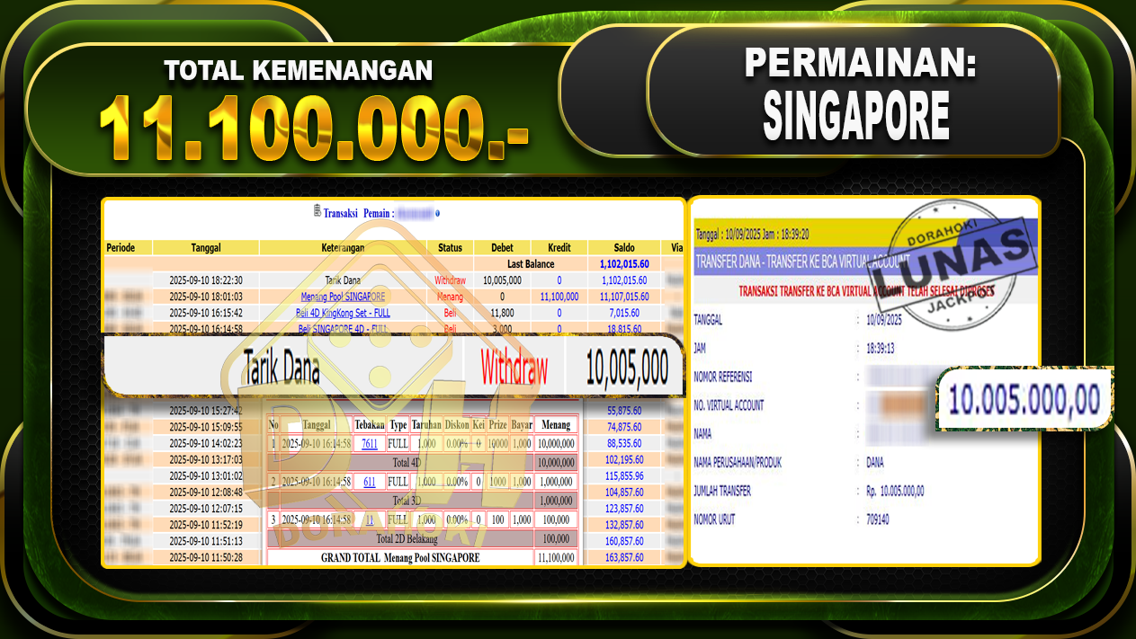 Bukti JP TOGEL SINGAPORE – ucapkan selamat kepada user id Ekaxxxx atas kemenangan di TOGEL SINGAPORE dengan total kemenangan Rp.11,100,000,- Yang pasti nya langsung LUNAS sesuai bukti ya bosku. Dorahoki nih bosku berapapun akan tetap kami bayar lunas ya bosku