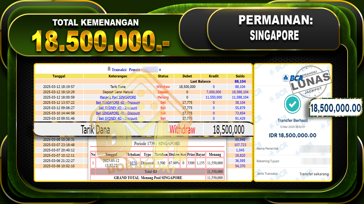 Bukti JP TOGEL SINGAPORE – ucapkan selamat kepada user id Gemxxx atas kemenangan di TOGEL SINGAPORE dengan total kemenangan Rp.18.500.000,- . Yang pasti nya langsung LUNAS sesuai bukti ya bosku. Dorahoki nih bosku berapapun akan tetap kami bayar lunas ya bosku.