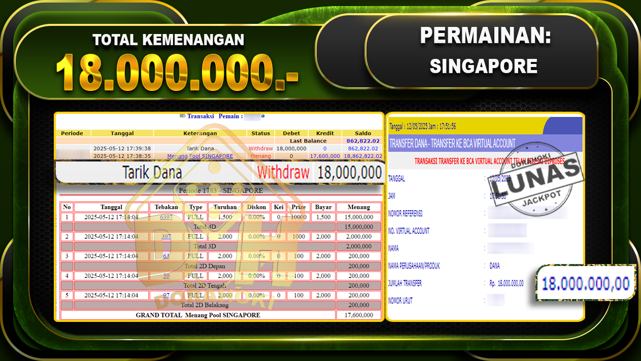 Bukti JP TOGEL SINGAPORE – ucapkan selamat kepada user id Melxxx atas kemenangan di TOGEL SINGAPORE dengan total kemenangan Rp.18.000.000,- . Yang pasti nya langsung LUNAS sesuai bukti ya bosku. Dorahoki nih bosku berapapun akan tetap kami bayar lunas ya bosku.