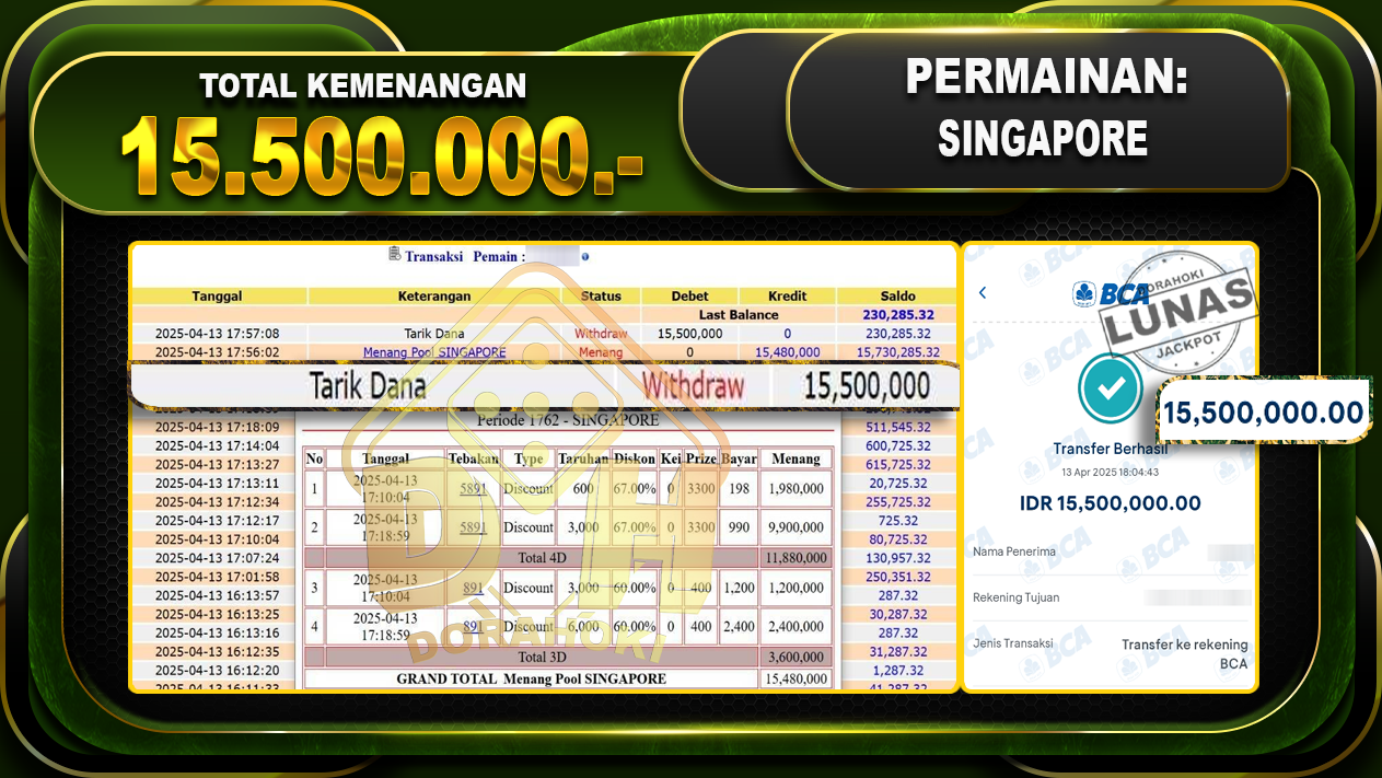 Bukti JP TOGEL SINGAPORE – ucapkan selamat kepada user id Voxxxx atas kemenangan di TOGEL SINGAPORE dengan total kemenangan Rp.15.500.000,- . Yang pasti nya langsung LUNAS sesuai bukti ya bosku. Dorahoki nih bosku berapapun akan tetap kami bayar lunas ya bosku.