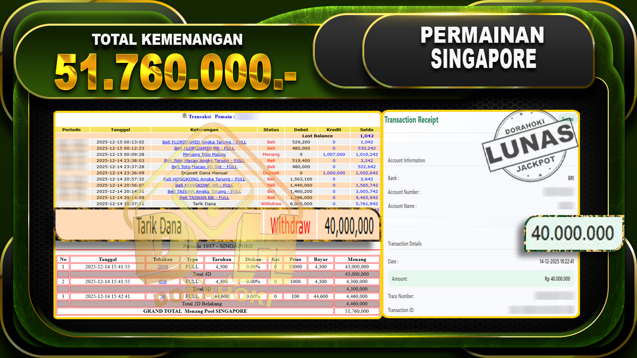 Bukti JP TOGEL SINGAPORE – ucapkan selamat kepada user id damxx atas kemenangan di TOGEL SINGAPORE dengan total kemenangan Rp.51,760,000,- Yang pasti nya langsung LUNAS sesuai bukti ya bosku. Dorahoki nih bosku berapapun akan tetap kami bayar lunas ya bosku