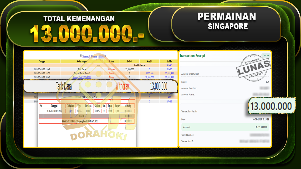 Bukti JP TOGEL SINGAPORE – Selamat Kepada User ID : G4nxxx atas kemenangan TOGEL SINGAPORE Dengan Nominal Sebesar Rp. 13.000.000,- . Yang pasti nya langsung LUNAS Sesuai Bukti.