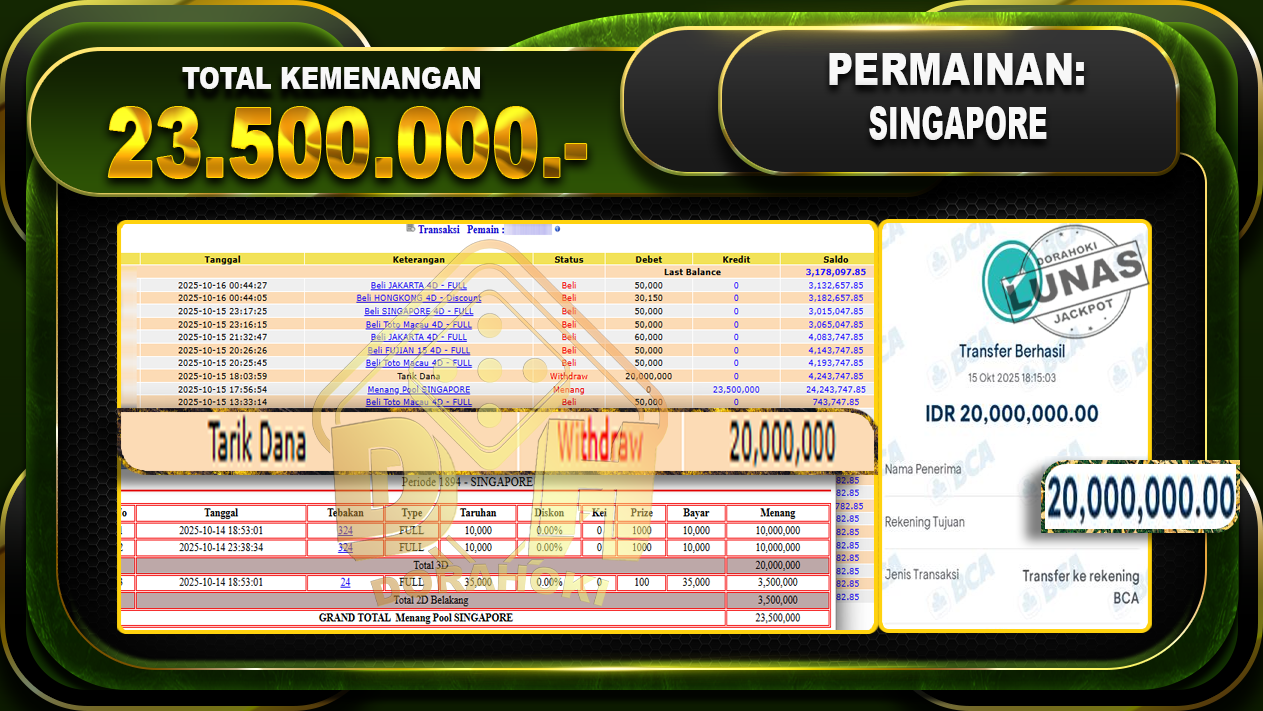 Bukti JP TOGEL SINGAPORE – ucapkan selamat kepada user id hokxxxxxx atas kemenangan di TOGEL SINGAPORE dengan total kemenangan Rp.23,500,000,- Yang pasti nya langsung LUNAS sesuai bukti ya bosku. Dorahoki nih bosku berapapun akan tetap kami bayar lunas ya bosku