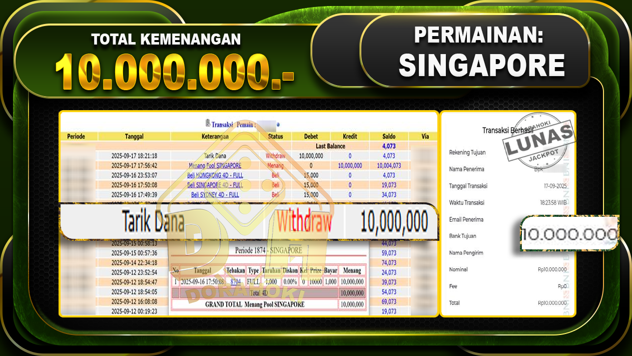 Bukti JP TOGEL SINGAPORE – ucapkan selamat kepada user id Makxxx atas kemenangan di TOGEL SINGAPORE dengan total kemenangan Rp.10,000,000,- Yang pasti nya langsung LUNAS sesuai bukti ya bosku. Dorahoki nih bosku berapapun akan tetap kami bayar lunas ya bosku