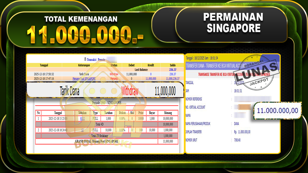 Bukti JP TOGEL SINGAPORE – ucapkan selamat kepada user id juhxxxx atas kemenangan di TOGEL SINGAPORE dengan total kemenangan Rp.11,000,000,- Yang pasti nya langsung LUNAS sesuai bukti ya bosku. Dorahoki nih bosku berapapun akan tetap kami bayar lunas ya bosku