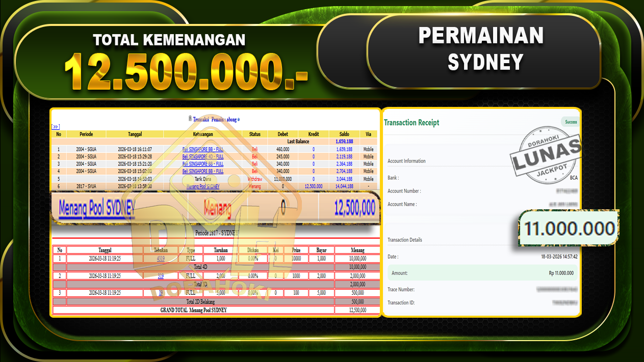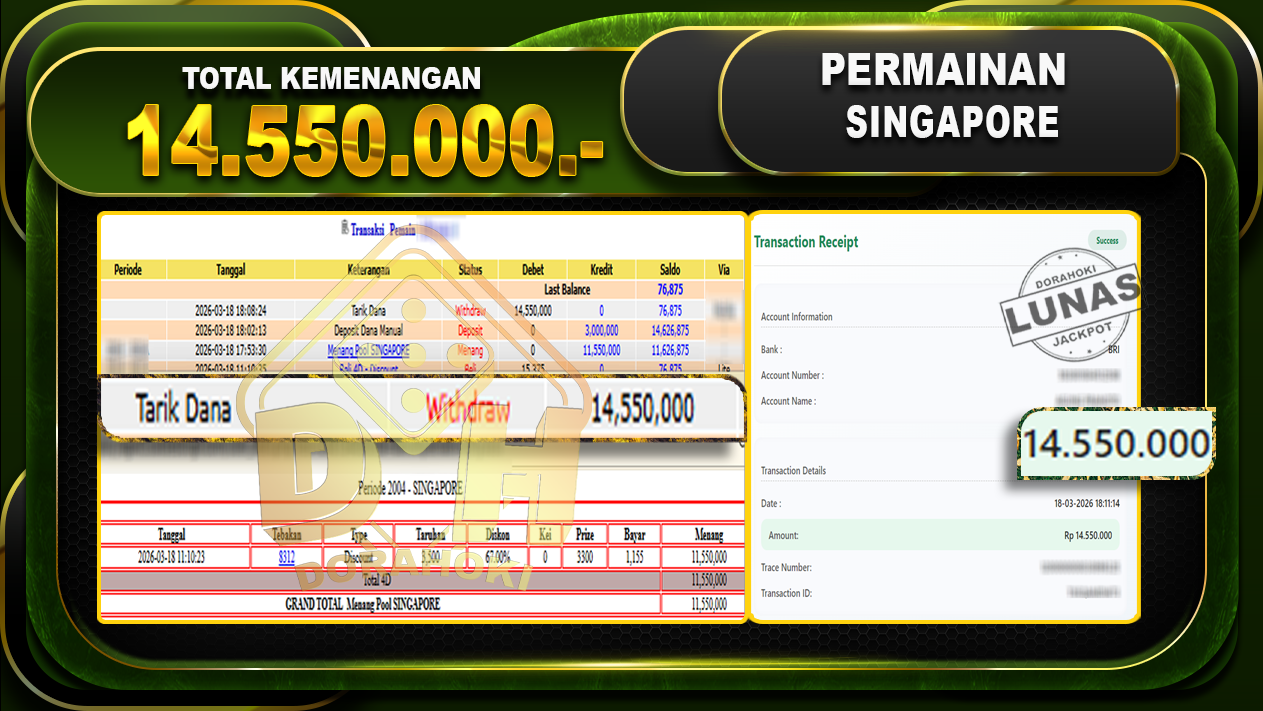 Bukti JP TOGEL SINGAPORE – Selamat Kepada User ID : H9txxx atas kemenangan TOGEL SINGAPORE Dengan Nominal Sebesar Rp. 14.550.000,- . Yang pasti nya langsung LUNAS Sesuai Bukti.