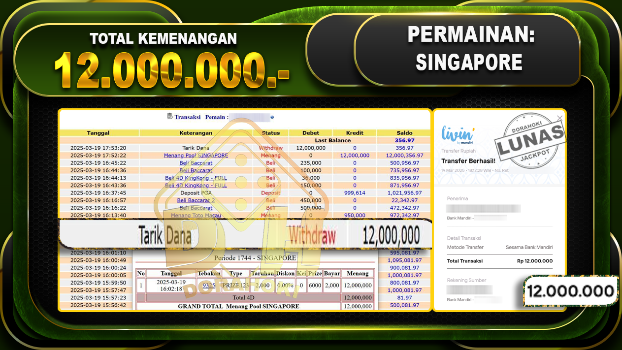 Bukti JP TOGEL SINGAPORE – ucapkan selamat kepada user id Budxxx atas kemenangan di  TOGEL SINGAPORE  dengan total kemenangan Rp.12.000.000,- . Yang pasti nya langsung LUNAS sesuai bukti ya bosku. Dorahoki nih bosku berapapun akan tetap kami bayar lunas ya bosku.