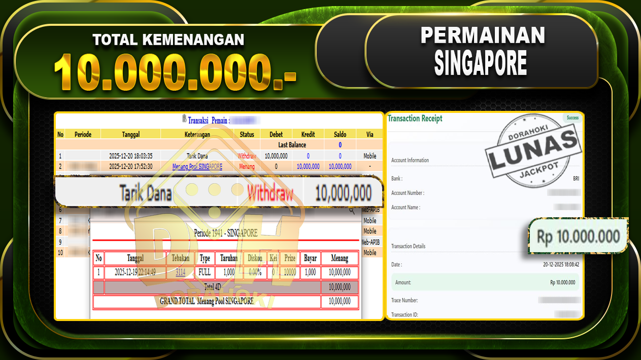 Bukti JP TOGEL SINGAPORE – ucapkan selamat kepada user id winxxxx atas kemenangan di TOGEL SINGAPORE dengan total kemenangan Rp.10,000,000,- Yang pasti nya langsung LUNAS sesuai bukti ya bosku. Dorahoki nih bosku berapapun akan tetap kami bayar lunas ya bosku