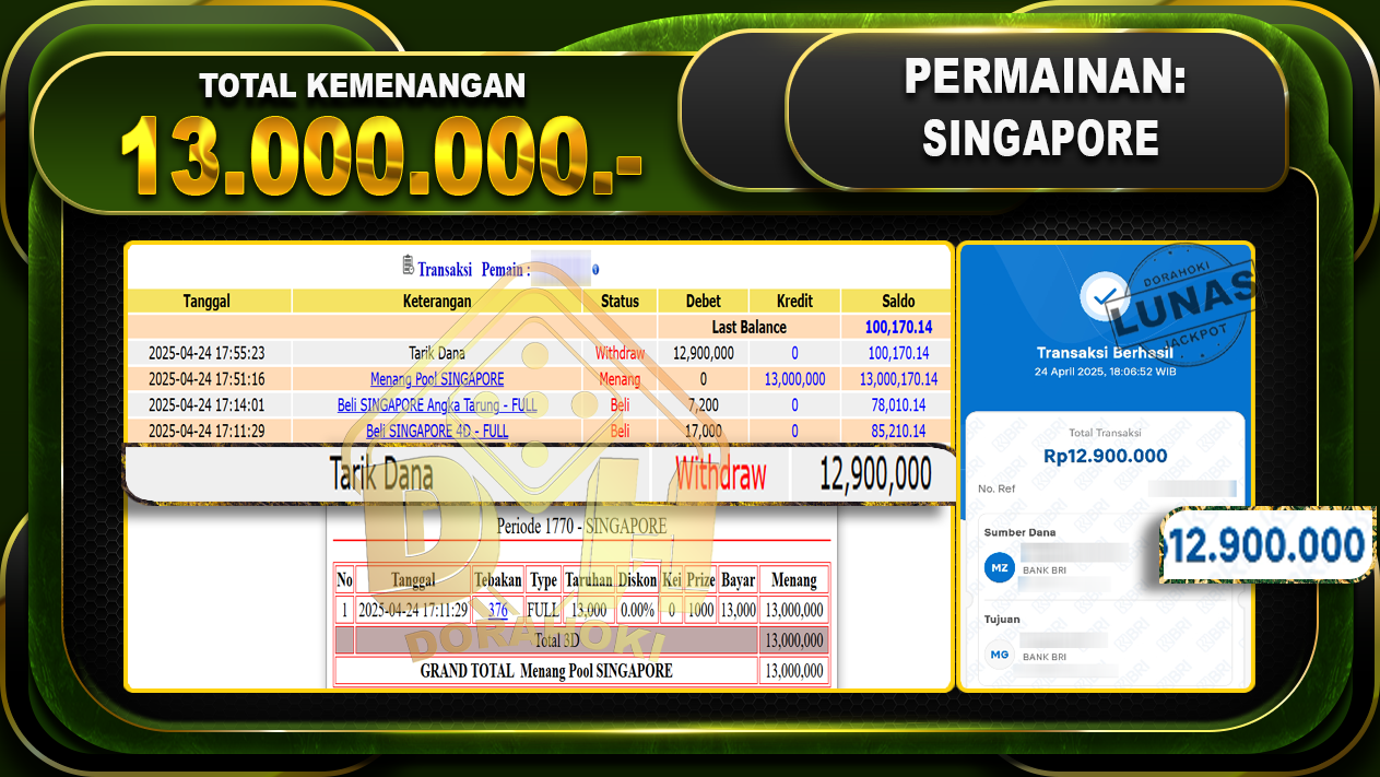 Bukti JP TOGEL SINGAPORE – ucapkan selamat kepada user id Kerxxx atas kemenangan di  TOGEL SINGAPORE  dengan total kemenangan Rp.13.000.000,- . Yang pasti nya langsung LUNAS sesuai bukti ya bosku. Dorahoki nih bosku berapapun akan tetap kami bayar lunas ya bosku.