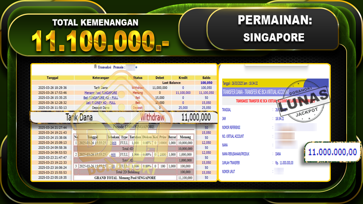 Bukti JP TOGEL SINGAPORE – ucapkan selamat kepada user id Garxxx atas kemenangan di  TOGEL SINGAPORE  dengan total kemenangan Rp.11.100.000,- . Yang pasti nya langsung LUNAS sesuai bukti ya bosku. Dorahoki nih bosku berapapun akan tetap kami bayar lunas ya bosku.
