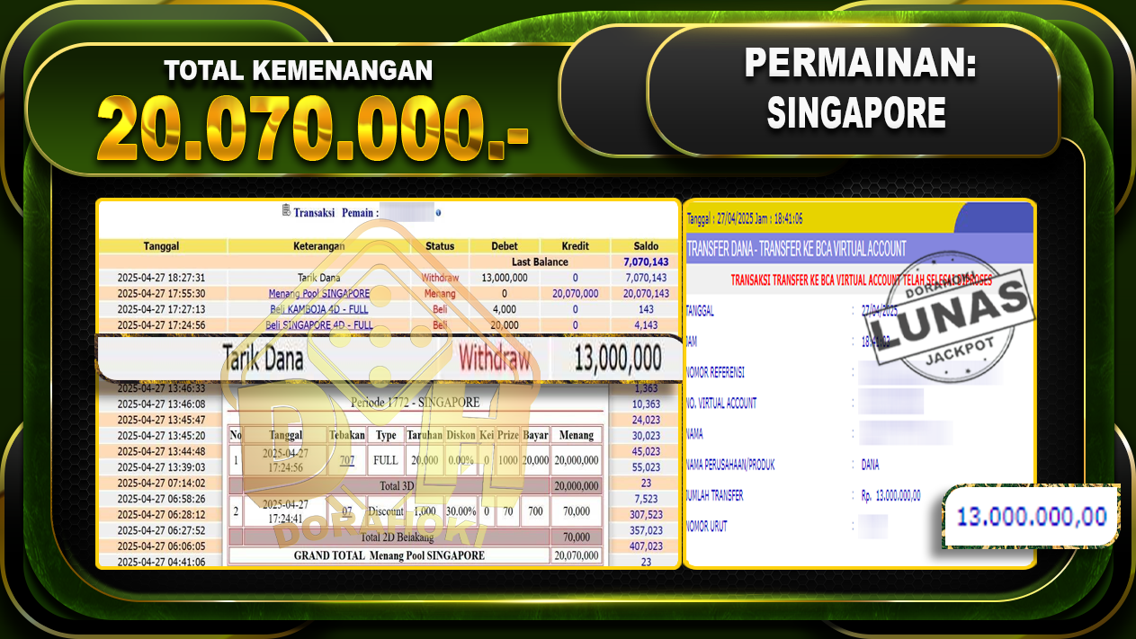 Bukti JP TOGEL SINGAPORE – ucapkan selamat kepada user id Antxxx atas kemenangan di TOGEL SINGAPORE dengan total kemenangan Rp.20.070.000,- . Yang pasti nya langsung LUNAS sesuai bukti ya bosku. Dorahoki nih bosku berapapun akan tetap kami bayar lunas ya bosku.