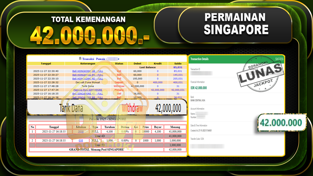 Bukti JP TOGEL SINGAPORE – ucapkan selamat kepada user id filxxxxx atas kemenangan di TOGEL SINGAPORE dengan total kemenangan Rp.42,000,000,- Yang pasti nya langsung LUNAS sesuai bukti ya bosku. Dorahoki nih bosku berapapun akan tetap kami bayar lunas ya bosku