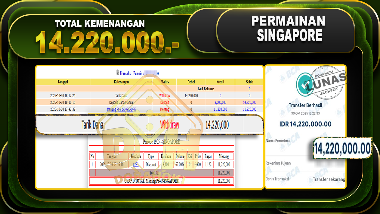 Bukti JP TOGEL SINGAPORE – ucapkan selamat kepada user id limxxxx atas kemenangan di  TOGEL SINGAPORE dengan total kemenangan Rp.14,220,000,- Yang pasti nya langsung LUNAS sesuai bukti ya bosku. Dorahoki nih bosku berapapun akan tetap kami bayar lunas ya bosku