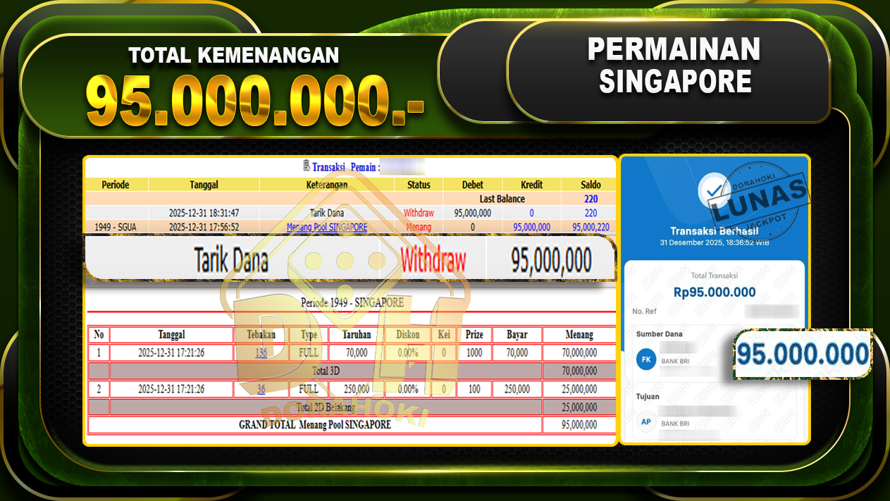 Bukti JP TOGEL SINGAPORE – ucapkan selamat kepada user id bacxx atas kemenangan di TOGEL SINGAPORE dengan total kemenangan Rp.95,000,000,- Yang pasti nya langsung LUNAS sesuai bukti ya bosku. Dorahoki nih bosku berapapun akan tetap kami bayar lunas ya bosku