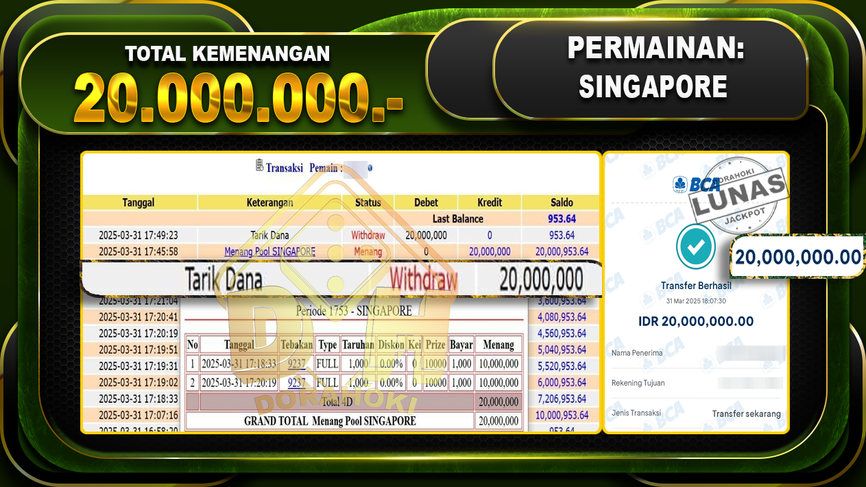 Bukti JP TOGEL SINGAPORE – ucapkan selamat kepada user id Gapxxx atas kemenangan di  TOGEL SINGAPORE  dengan total kemenangan Rp.20.000.000,- . Yang pasti nya langsung LUNAS sesuai bukti ya bosku. Dorahoki nih bosku berapapun akan tetap kami bayar lunas ya bosku.