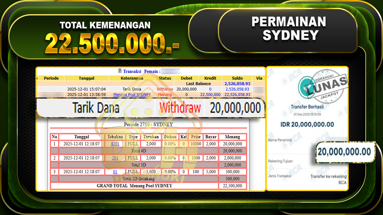 Bukti JP TOGEL SYDNEY – ucapkan selamat kepada user id okixxxx atas kemenangan di  TOGEL SYDNEY dengan total kemenangan Rp.22,500,000,- Yang pasti nya langsung LUNAS sesuai bukti ya bosku. Dorahoki nih bosku berapapun akan tetap kami bayar lunas ya bosku