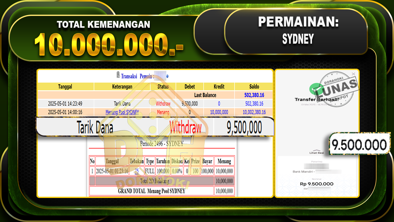 Bukti JP TOGEL SYDNEY – ucapkan selamat kepada user id Kikxxx atas kemenangan di TOGEL SYDNEY dengan total kemenangan Rp.10.000.000,- . Yang pasti nya langsung LUNAS sesuai bukti ya bosku. Dorahoki nih bosku berapapun akan tetap kami bayar lunas ya bosku.