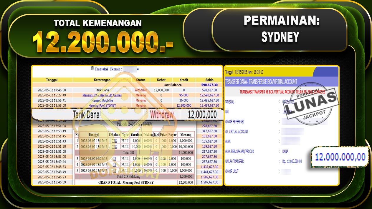 Bukti JP TOGEL SYDNEY – ucapkan selamat kepada user id Kidxxx atas kemenangan di TOGEL SYDNEY dengan total kemenangan Rp.12.200.000,- . Yang pasti nya langsung LUNAS sesuai bukti ya bosku. Dorahoki nih bosku berapapun akan tetap kami bayar lunas ya bosku.