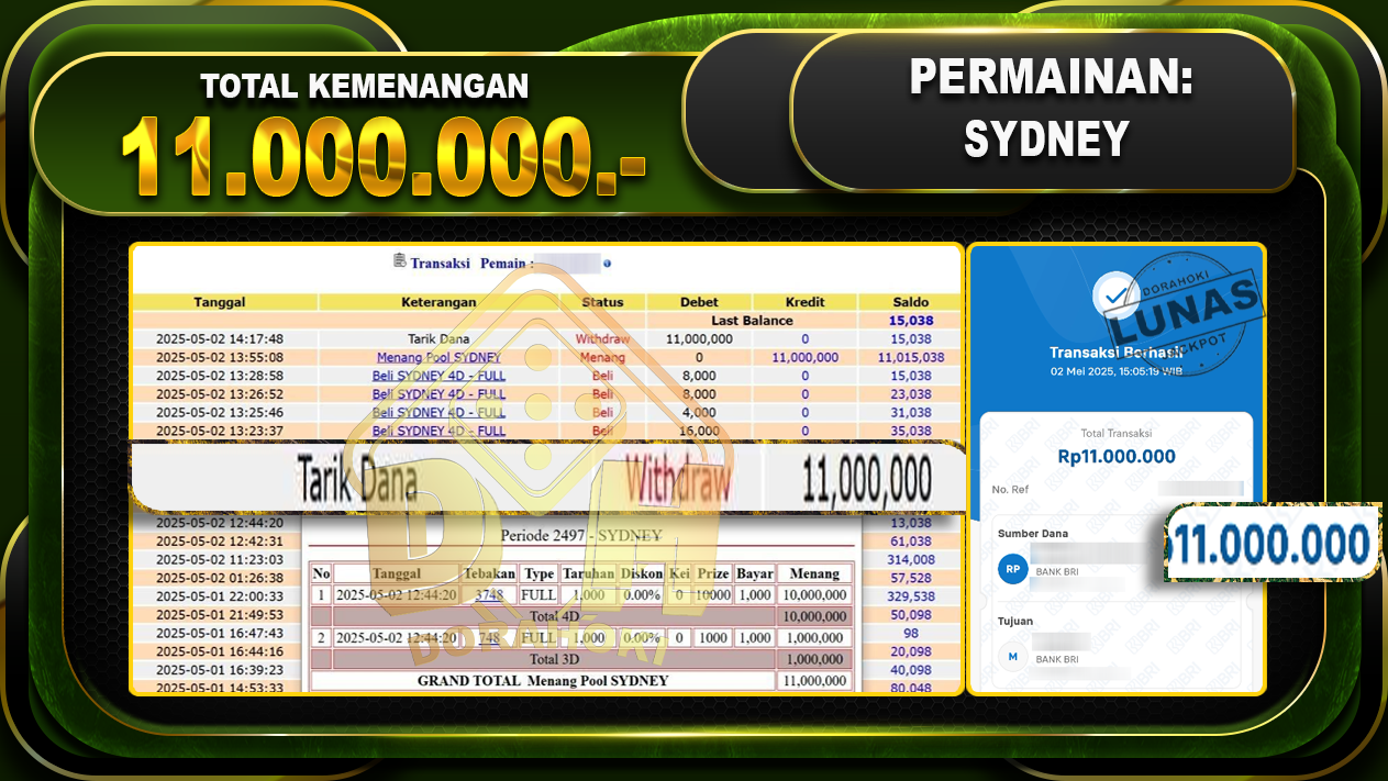 Bukti JP TOGEL SYDNEY – ucapkan selamat kepada user id Masxxx atas kemenangan di  TOGEL SYDNEY  dengan total kemenangan Rp.11.000.000,- . Yang pasti nya langsung LUNAS sesuai bukti ya bosku. Dorahoki nih bosku berapapun akan tetap kami bayar lunas ya bosku.