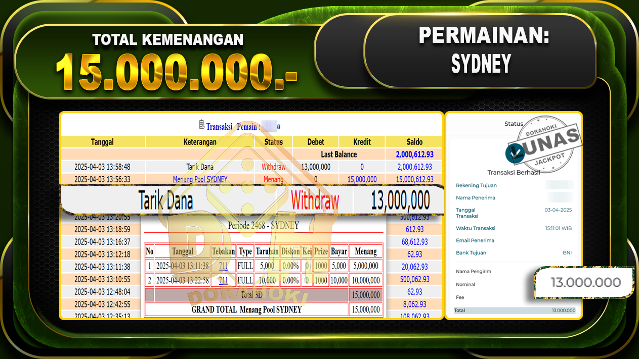 Bukti JP TOGEL SYDNEY – ucapkan selamat kepada user id Lopxxx atas kemenangan di TOGEL SYDNEY dengan total kemenangan Rp.15.000.000,- . Yang pasti nya langsung LUNAS sesuai bukti ya bosku. Dorahoki nih bosku berapapun akan tetap kami bayar lunas ya bosku.
