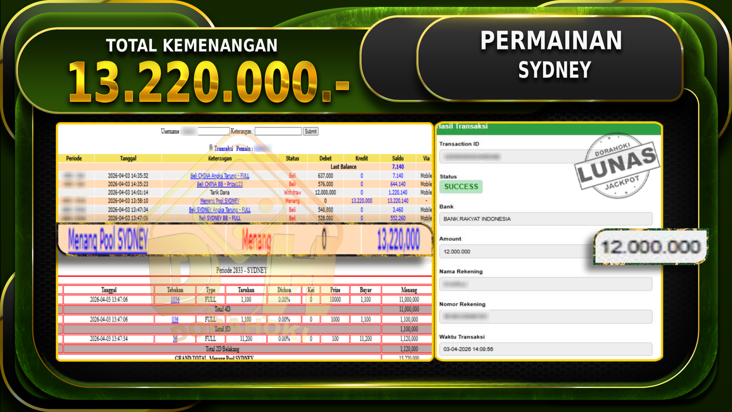 Bukti JP TOGEL SYDNEY – Selamat Kepada User ID : Damxxx atas kemenangan TOGEL SYDNEY Dengan Nominal Sebesar Rp 13.220.000,- . Yang pasti nya langsung LUNAS Sesuai Bukti.