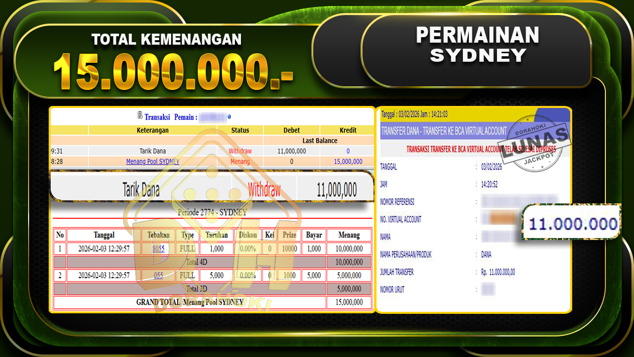 Bukti JP TOGEL SYDNEY – Selamat Kepada User ID : arixxx atas kemenangan TOGEL SYDNEY Dengan Nominal Sebesar Rp 15.000.000,- . Yang pasti nya langsung LUNAS Sesuai Bukti.