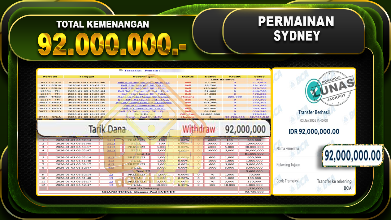 Bukti JP TOGEL SYDNEY – ucapkan selamat kepada user id koexxxxx atas kemenangan di TOGEL SYDNEY dengan total kemenangan Rp.92.000.000,- Yang pasti nya langsung LUNAS sesuai bukti ya bosku. Dorahoki nih bosku berapapun akan tetap kami bayar lunas ya bosku