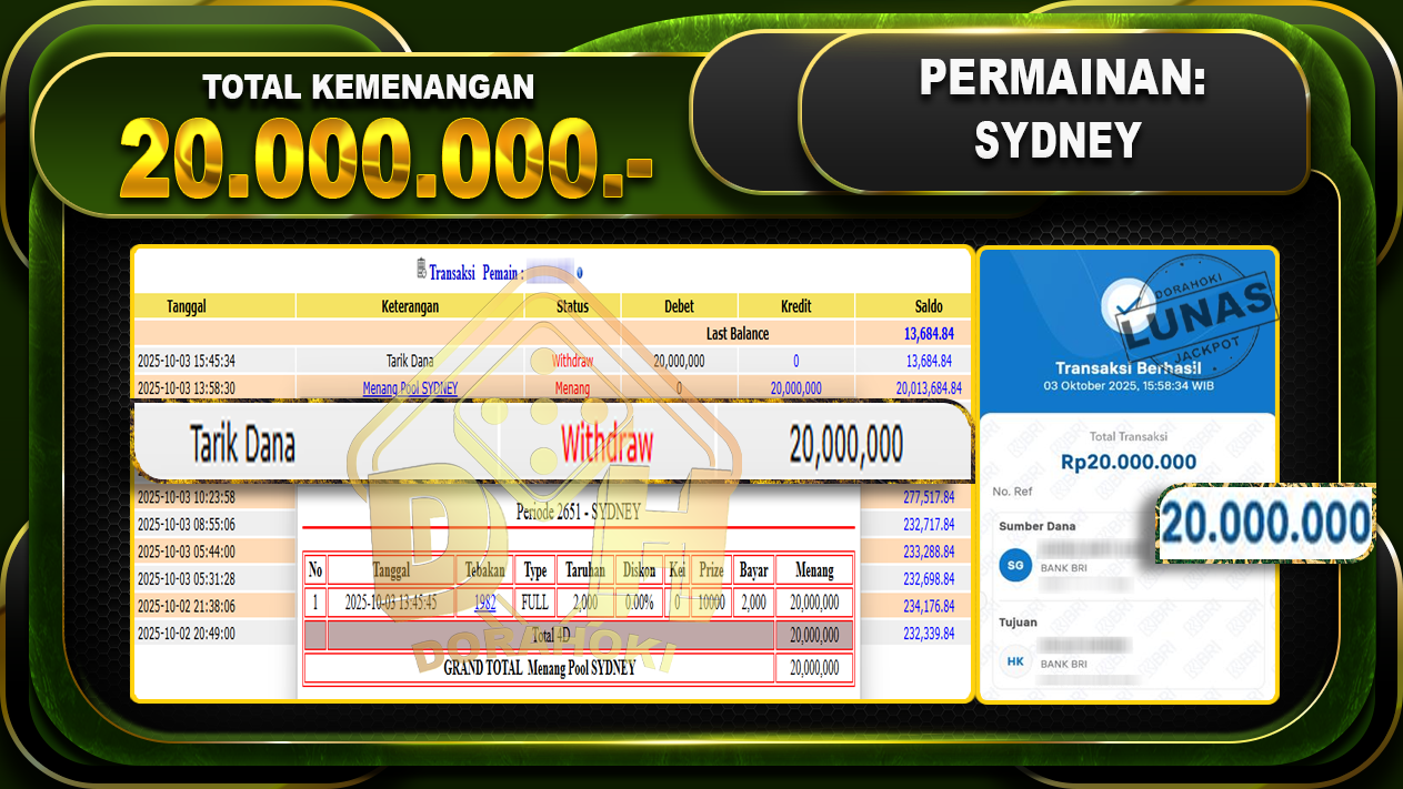 Bukti JP TOGEL SYDNEY – ucapkan selamat kepada user id gacxxxxxx atas kemenangan di TOGEL SYDNEY dengan total kemenangan Rp.20,000,000,- Yang pasti nya langsung LUNAS sesuai bukti ya bosku. Dorahoki nih bosku berapapun akan tetap kami bayar lunas ya bosku