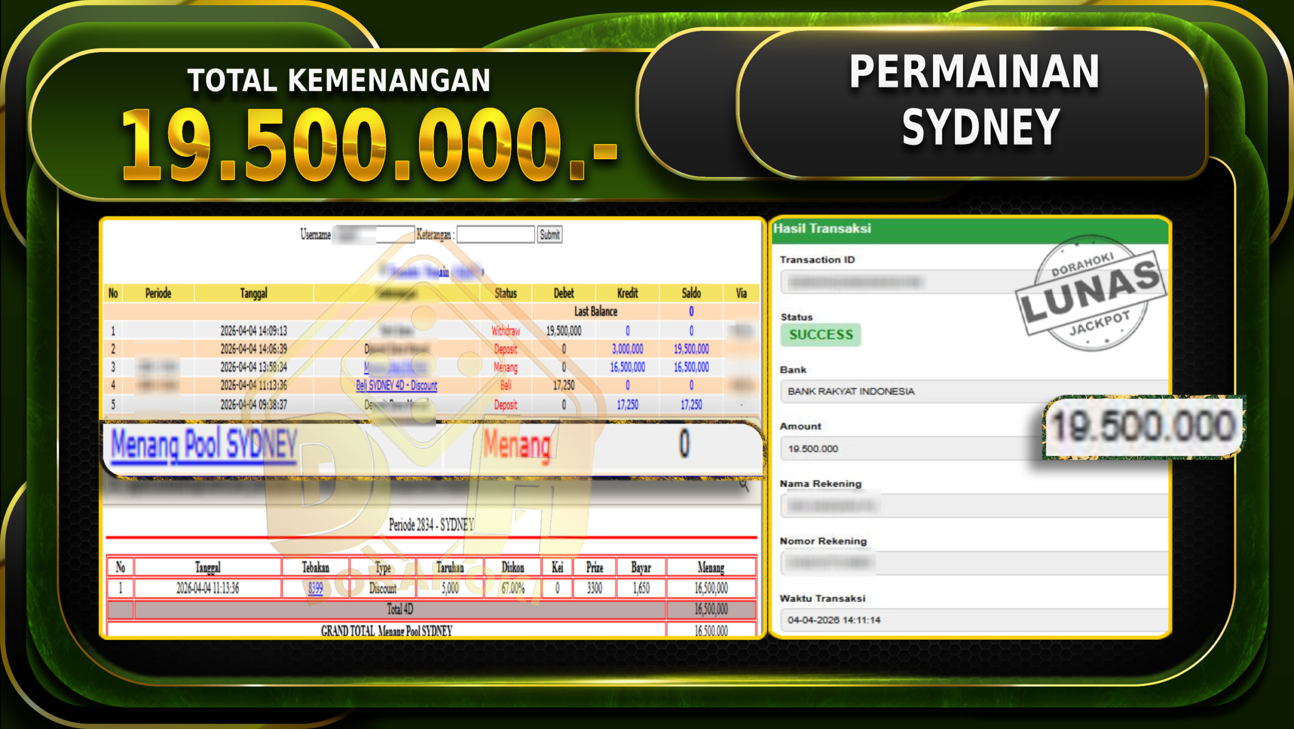 Bukti JP TOGEL SYDNEY – Selamat Kepada User ID : Diaxxx atas kemenangan TOGEL SYDNEY Dengan Nominal Sebesar Rp 19.500.000,- . Yang pasti nya langsung LUNAS Sesuai Bukti.