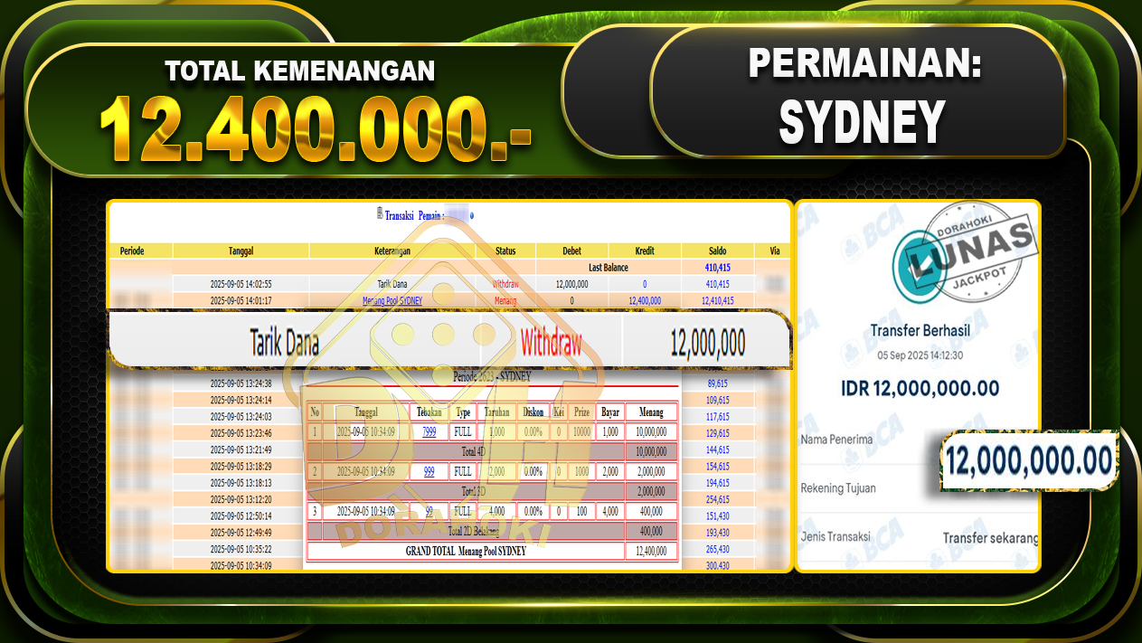 Bukti JP TOGEL SYDNEY – ucapkan selamat kepada user id Adxxxxx atas kemenangan di  TOGEL SYDNEY dengan total kemenangan Rp.12,400,000,- Yang pasti nya langsung LUNAS sesuai bukti ya bosku. Dorahoki nih bosku berapapun akan tetap kami bayar lunas ya bosku
