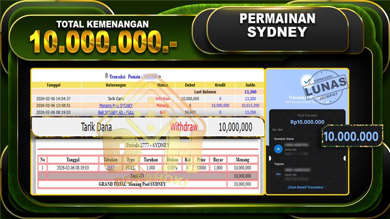 Bukti JP TOGEL SYDNEY – Selamat Kepada User ID : bubxxx atas kemenangan TOGEL SYDNEY Dengan Nominal Sebesar Rp 10.000.000,- . Yang pasti nya langsung LUNAS Sesuai Bukti.