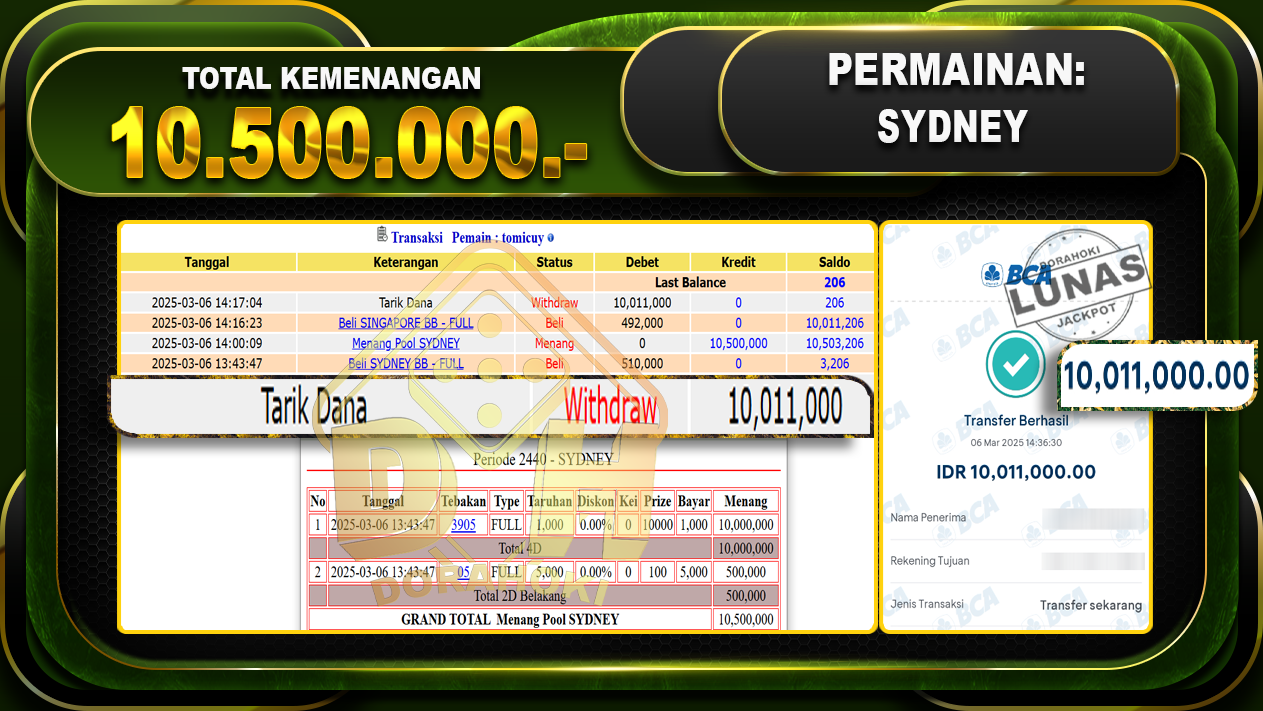 Bukti JP TOGEL SYDNEY – ucapkan selamat kepada user id Tomxxx atas kemenangan di TOGEL SYDNEY dengan total kemenangan Rp.10.500.000,- . Yang pasti nya langsung LUNAS sesuai bukti ya bosku. Dorahoki nih bosku berapapun akan tetap kami bayar lunas ya bosku.