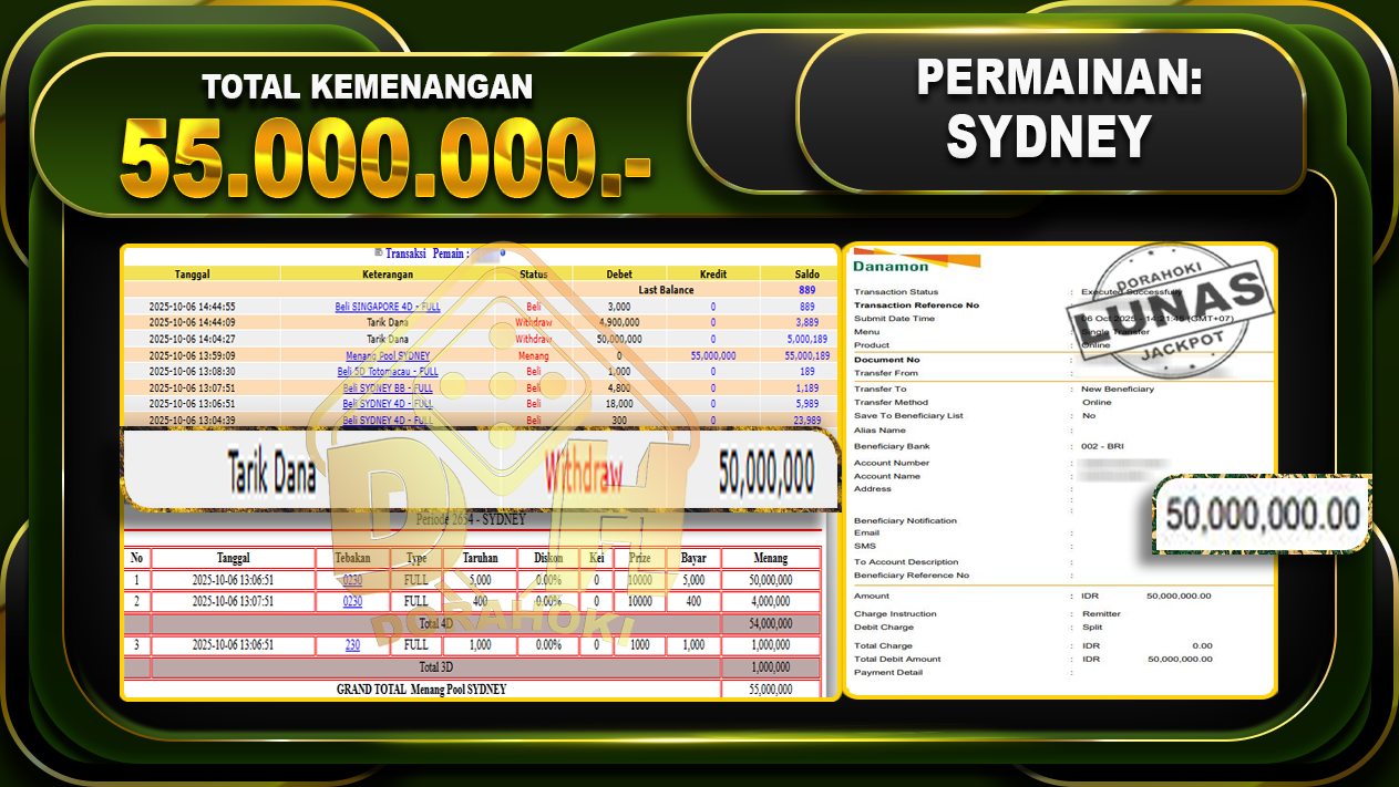 Bukti JP TOGEL SYDNEY – ucapkan selamat kepada user id lomxxx atas kemenangan di TOGEL SYDNEY dengan total kemenangan Rp.55,000,000,- Yang pasti nya langsung LUNAS sesuai bukti ya bosku. Dorahoki nih bosku berapapun akan tetap kami bayar lunas ya bosku