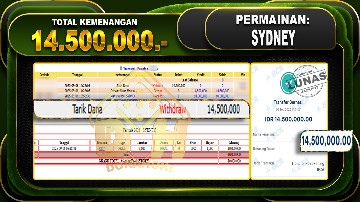 Bukti JP TOGEL SYDNEY – ucapkan selamat kepada user id Cerxx atas kemenangan di TOGEL SYDNEY dengan total kemenangan Rp.14,500,000,- Yang pasti nya langsung LUNAS sesuai bukti ya bosku. Dorahoki nih bosku berapapun akan tetap kami bayar lunas ya bosku