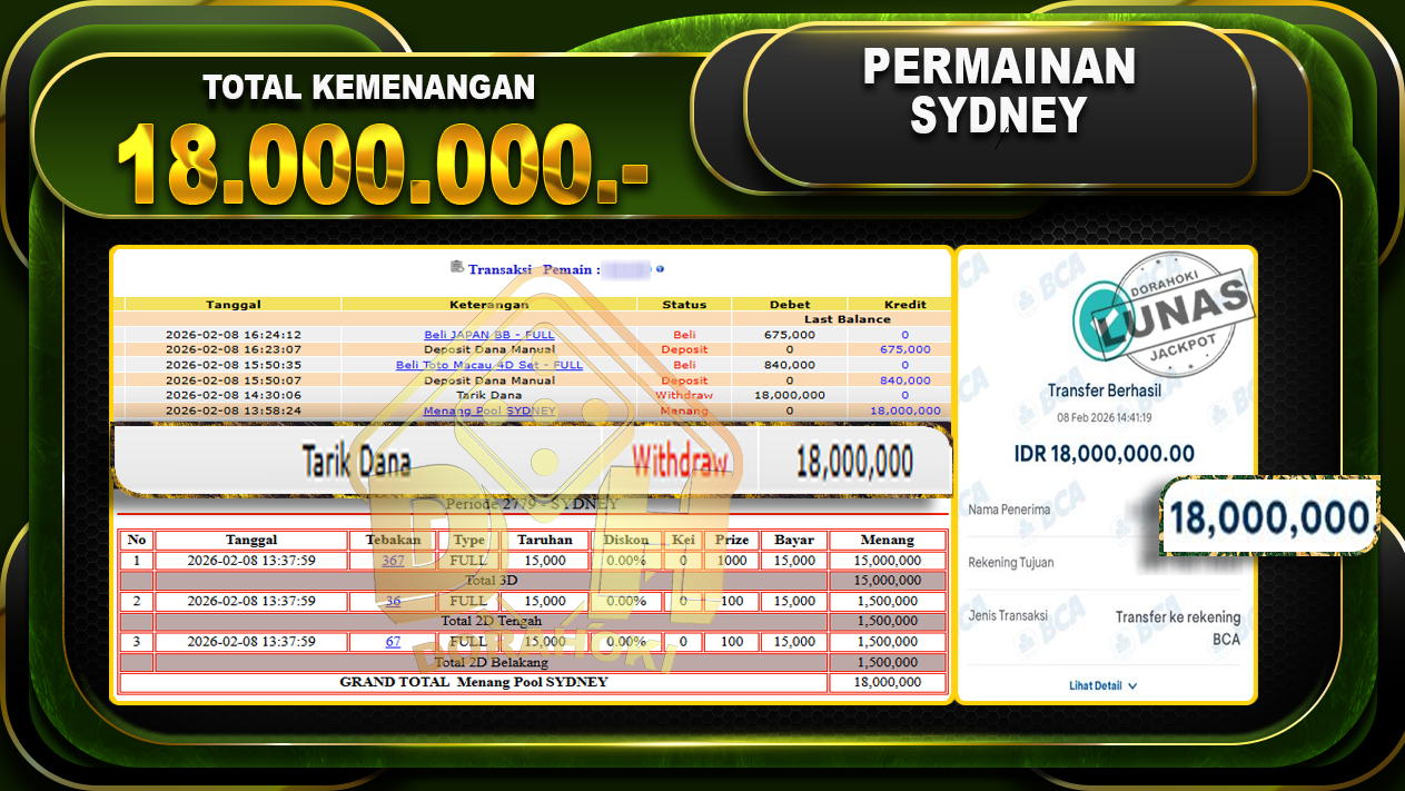 Bukti JP TOGEL SYDNEY – Selamat Kepada User ID : harxxx atas kemenangan TOGEL SYDNEY Dengan Nominal Sebesar Rp 18.000.000,- . Yang pasti nya langsung LUNAS Sesuai Bukti.