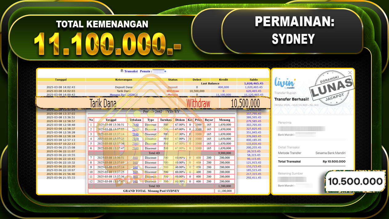 Bukti JP TOGEL SYDNEY – ucapkan selamat kepada user id Rayxxx atas kemenangan di TOGEL SYDNEY dengan total kemenangan Rp.11.000.000,- . Yang pasti nya langsung LUNAS sesuai bukti ya bosku. Dorahoki nih bosku berapapun akan tetap kami bayar lunas ya bosku.