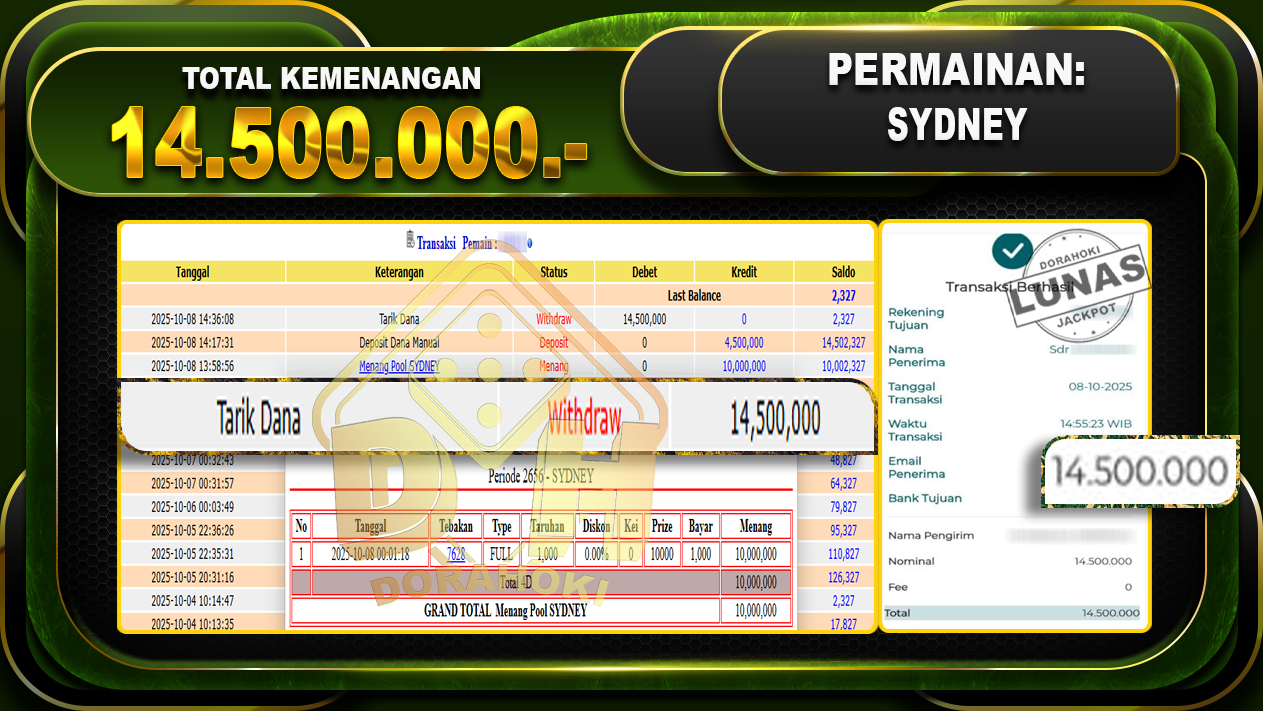 Bukti JP TOGEL SYDNEY – ucapkan selamat kepada user id askxxxx atas kemenangan di  TOGEL SYDNEY dengan total kemenangan Rp.14,500,000,- Yang pasti nya langsung LUNAS sesuai bukti ya bosku. Dorahoki nih bosku berapapun akan tetap kami bayar lunas ya bosku