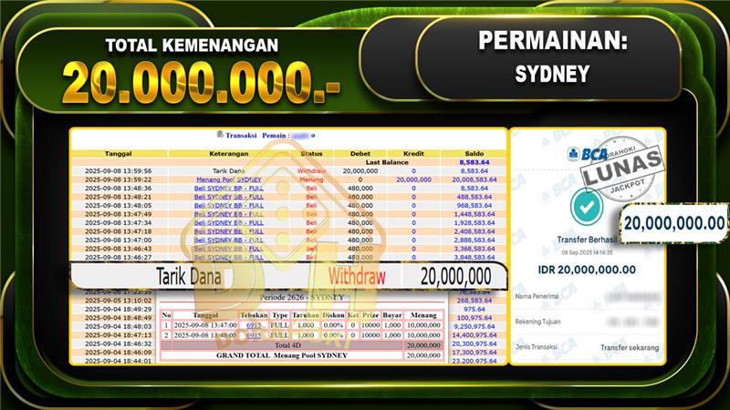 Bukti JP TOGEL SYDNEY – ucapkan selamat kepada user id Gapxxxxx atas kemenangan di TOGEL SYDNEY dengan total kemenangan Rp.20,000,000,- Yang pasti nya langsung LUNAS sesuai bukti ya bosku. Dorahoki nih bosku berapapun akan tetap kami bayar lunas ya bosku