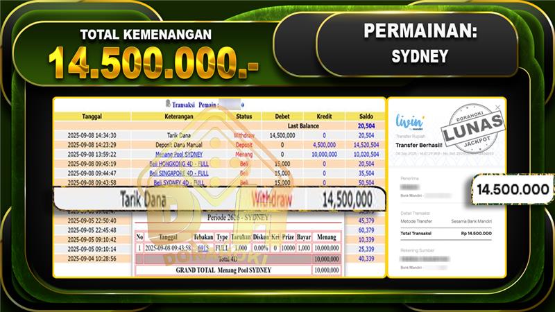Bukti JP TOGEL SYDNEY – ucapkan selamat kepada user id Holxxxxx atas kemenangan di TOGEL SYDNEY dengan total kemenangan Rp.14,500,000,- Yang pasti nya langsung LUNAS sesuai bukti ya bosku. Dorahoki nih bosku berapapun akan tetap kami bayar lunas ya bosku